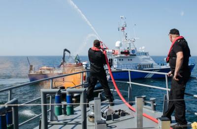 3. uzdevums - nodzēst ugunsgrēku uz kutera, likvidēt sūci uz kutera un vilkt tauvā bez vadības palikušu kuteri.